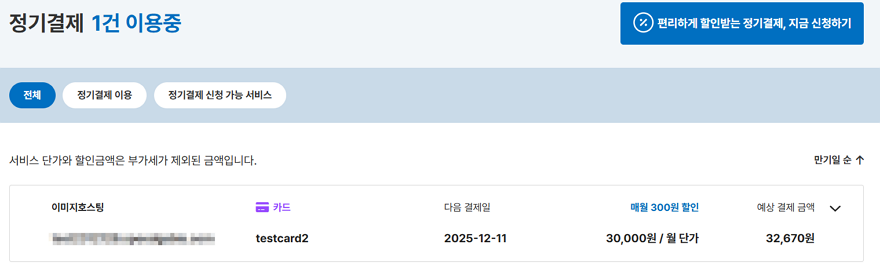 • 해당 이미지는 서비스 이해를 돕기 위해 가상으로 작성된 예시로, 실제 이용하시는 서비스 금액과 다를 수 있습니다. • 정기결제 신청 불가한 서비스는 '정기결제 신청' 버튼이 활성화 되지 않습니다. |