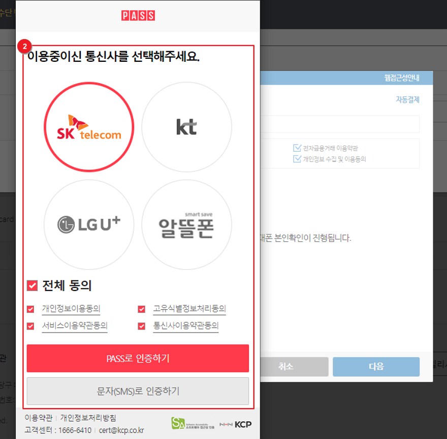 ② 이용 중인 통신사를 선택하고 [PASS 인증], 혹은 [SMS인증]을 클릭하여 인증을 완료합니다.