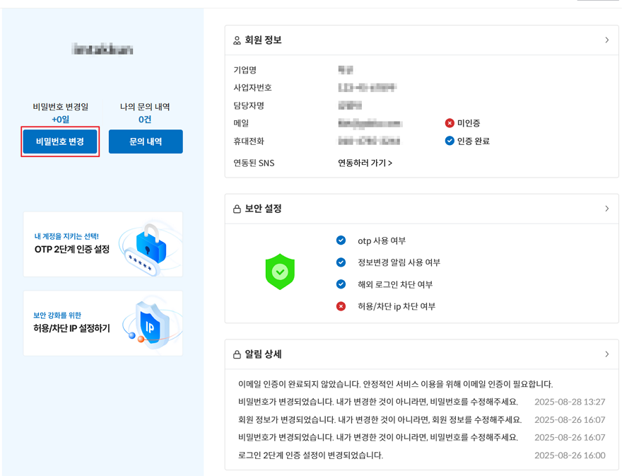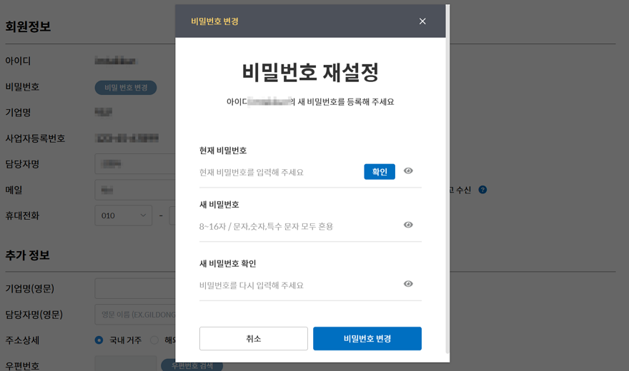 [비밀번호 변경]을 클릭해 새로운 비밀번호를 설정합니다.