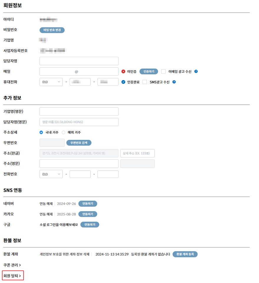 5. 회원 정보 페이지 하단의 [회원 탈퇴]를 클릭합니다.