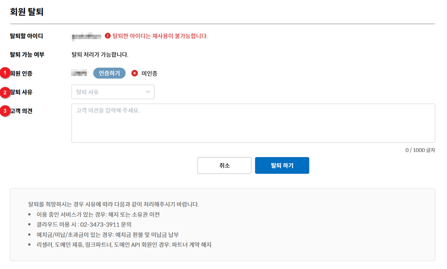 • 탈퇴한 아이디는 재사용이 불가합니다. • 이용중인 서비스가 있는 경우 서비스 해지 또는 소유권 이전을 완료 후 탈퇴 신청이 가능합니다. • 예치금/미납/초과금이 있는 경우 예치금 환불 및 미납금을 납부한 후 탈퇴 신청이 가능합니다. • SNS 연동 중인 경우에는 [My가비아 > 회원 정보 > SNS 연계> 연동 해제]를 클릭해 연동 해제 후 탈퇴 신청이 가능합니다. • 리셀러, 도메인 제휴, 도메인 API 회원인 경우 파트너 계약 해지 후 탈퇴 신청이 가능합니다. • 회원 탈퇴는 탈퇴 신청 후 바로 처리되어 계정 복구가 불가하므로 신중히 진행해 주세요. |
